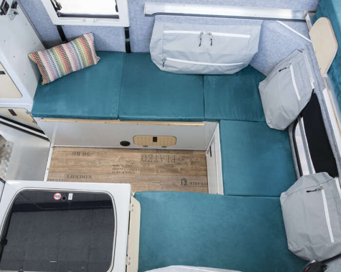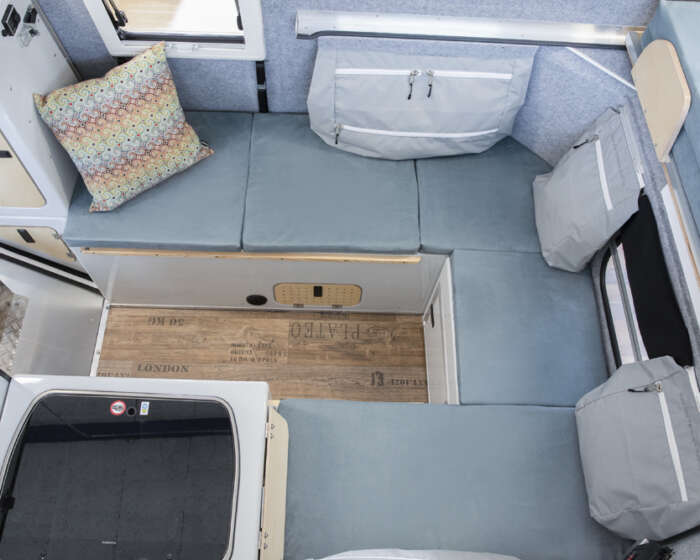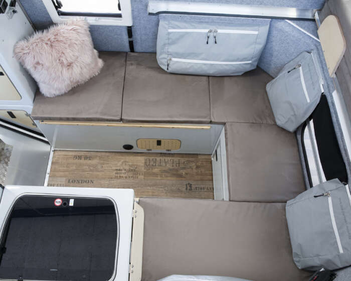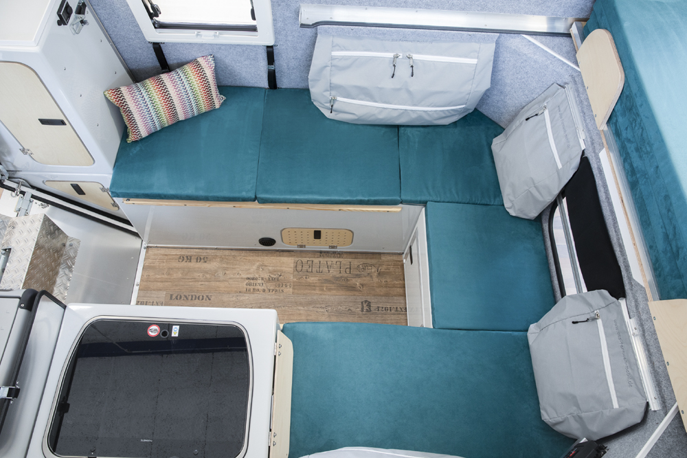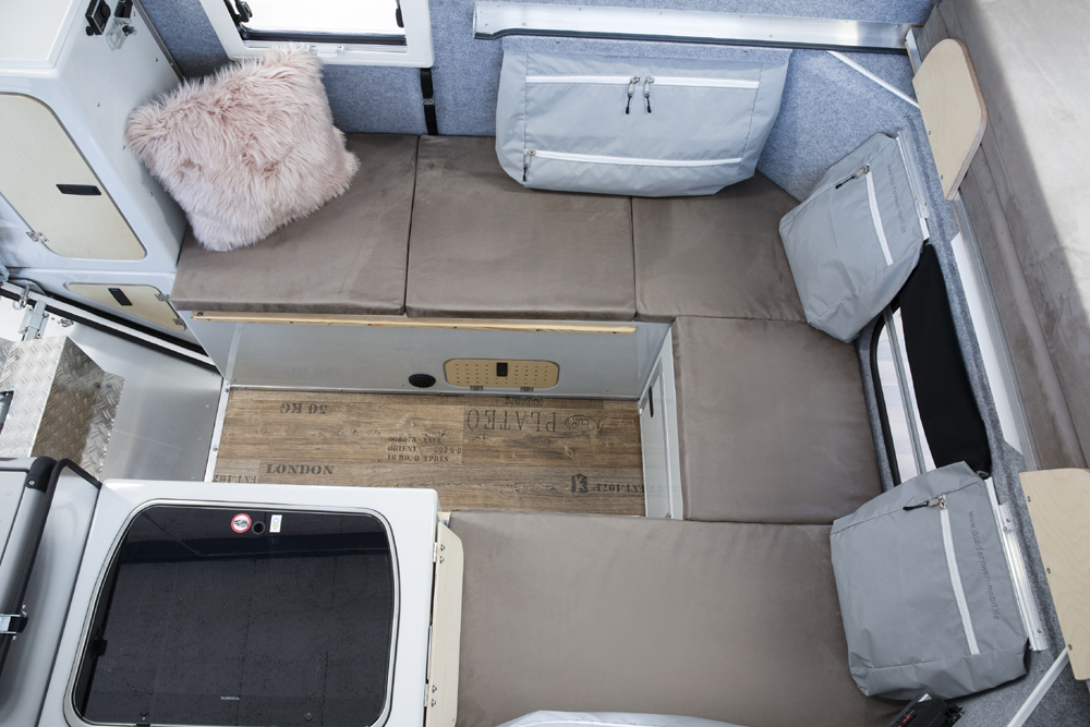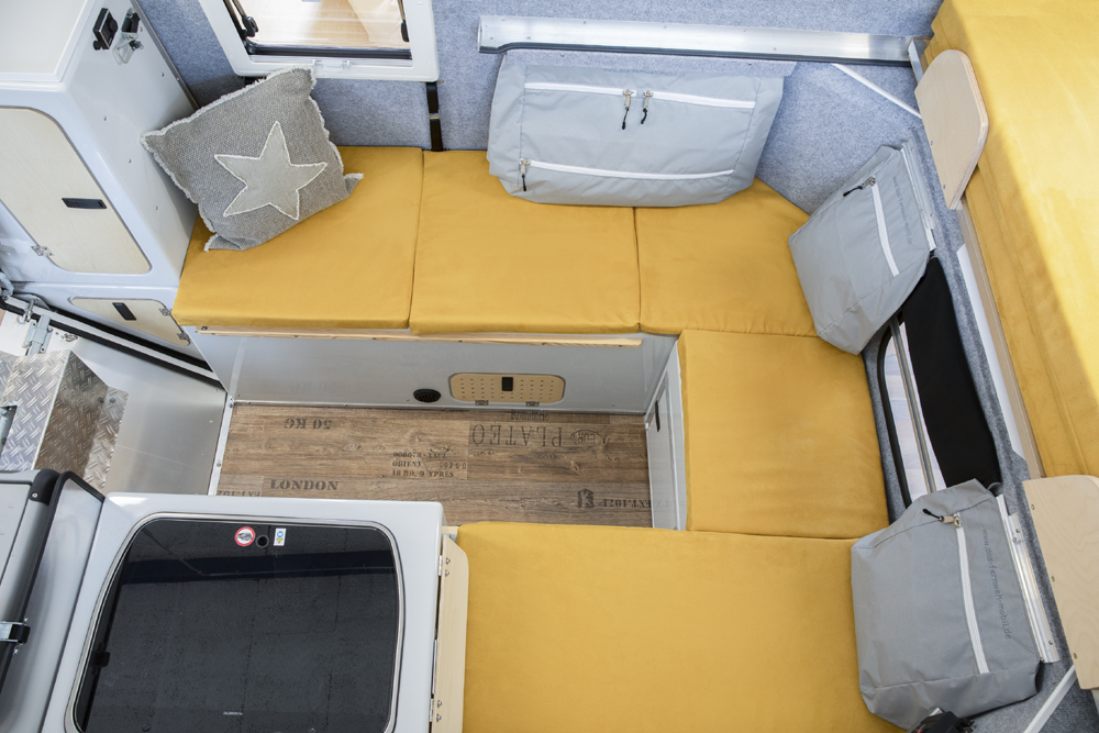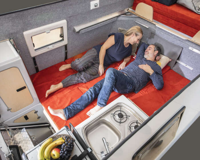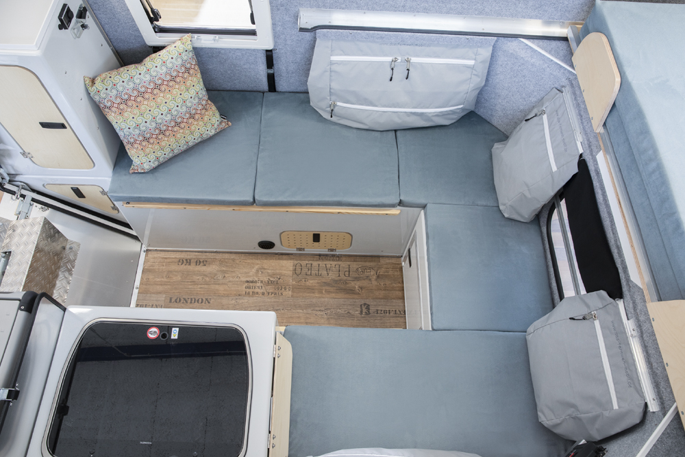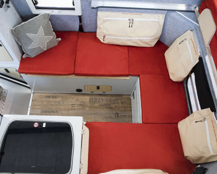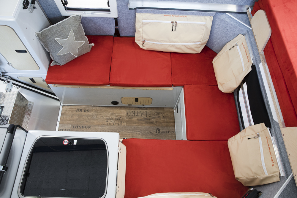 Das Bett wird herausgezogen und bietet eine Liegefläche von 160cm x 230cm. Die Sitzbänke mit den Staufächern werden mit Polstern abgedeckt. Bei Bedarf lassen sich der Tisch und eine weitere Platte zwischen die Sitzbänke einlegen. Damit erhält man im unteren Bereich eine weitere Schlafmöglichkeit. Diese lässt sich hervorragend bei geschlossenem Dach nutzen.